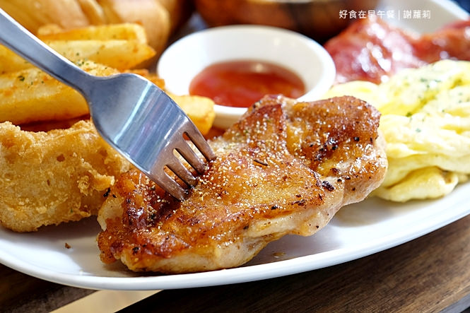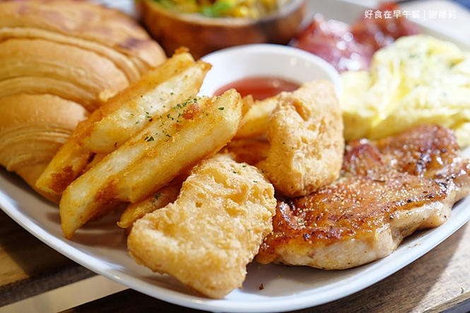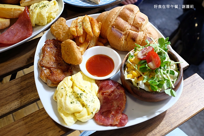 搭配的食材也稱得上豐富多樣化,生菜沙拉、培根、雞塊、黃金脆薯、嫩蛋、可頌麵包及香煎雞腿排,舖疊著這張白瓷餐盤,而且賣相瞧上去也是十分可口呢!
