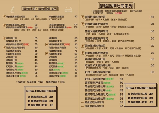 Menu一頁兩面,有碳烤吐司、碳烤漢堡、熱押吐司及早午餐套餐,其它還有一些炸物小點心,注意到它們家的冬瓜茶是新竹高家的,這個比較特別,因為坊間常見多用台南義豐,有興趣的朋友也可以試試看。