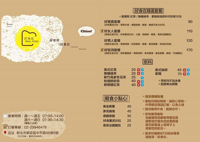 這家好食在早餐,是我最近很喜歡的一間店,整體來說味道算是不錯,重點是,它的價格真的好可愛,滿滿一盤還附加飲料,最便宜只要90元就可以吃得到,還沒造訪前還不知道它是如此小資價格,難怪生意會好到每個時刻段乎都在排隊,跟我一樣愛吃早午餐的朋友們,真的強烈推薦你們一定要把這間收到口袋名單!