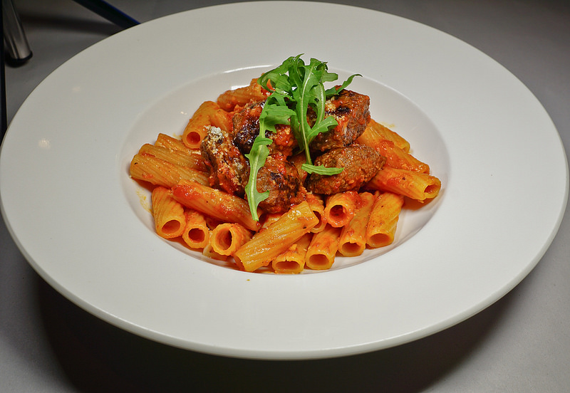美國牛肉、大蒜、帕達諾起士、水牛乳起士、管麵組合而成, 最上面再放上幾葉目前最紅的芝麻葉