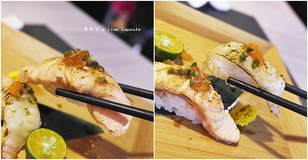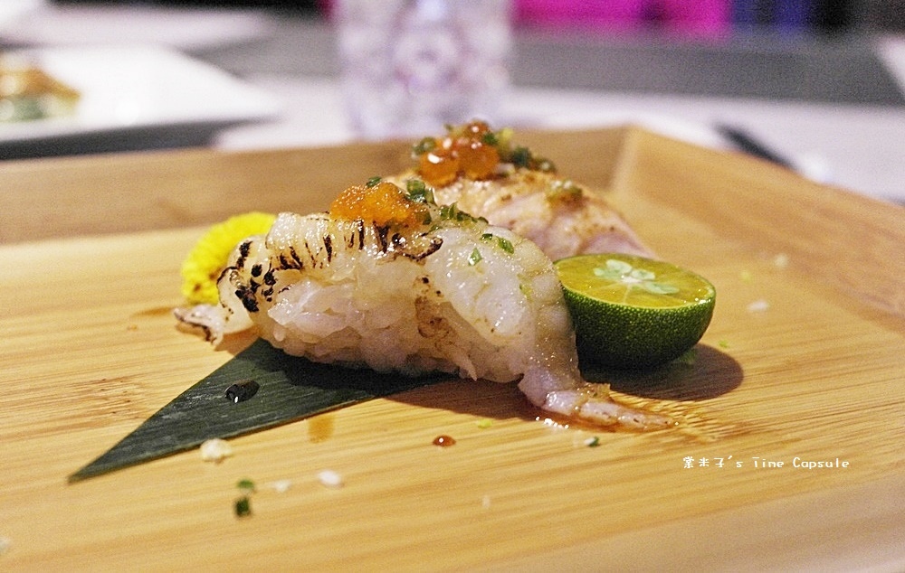 細緻的比目魚握壽司點綴著蝦卵和頂著晶瑩剔透鮭魚卵的鮭魚握壽司炙燒後的香氣和味道都很不賴!