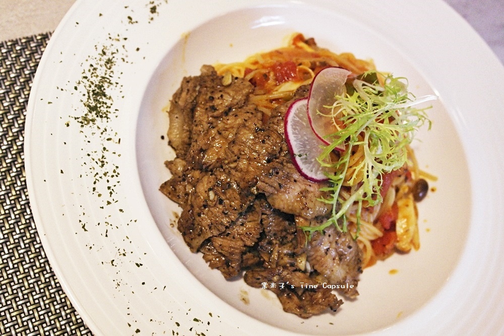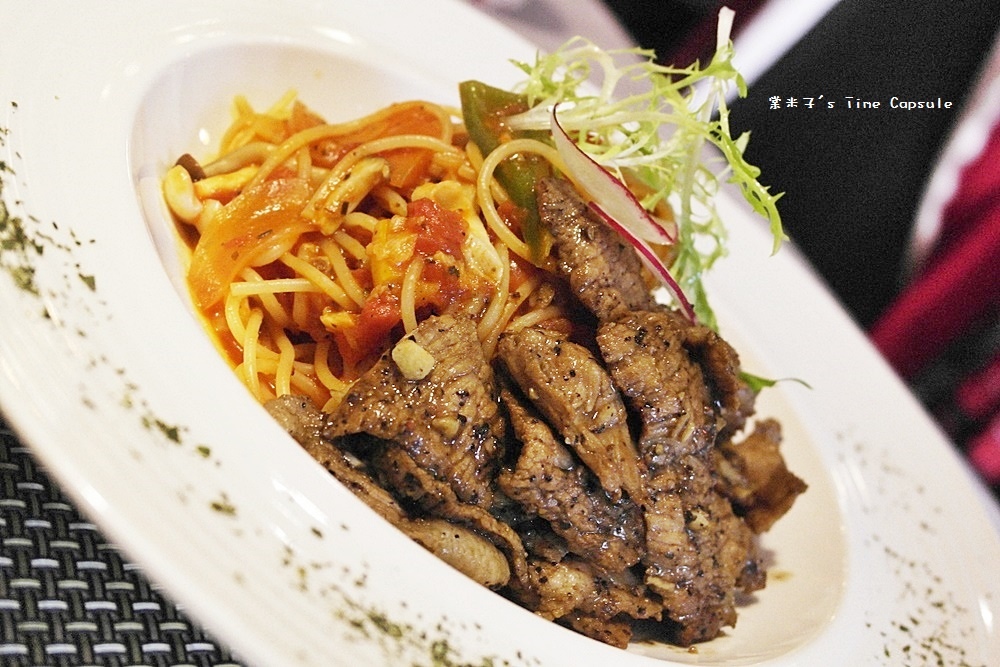 照燒的鹹甜松阪豬、滑溜的義大利麵、酸甜的紅醬搭配的非常棒!