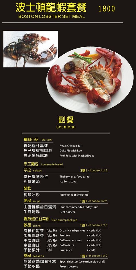 當然除了波士頓龍蝦外還有其他套餐像是9A和牛、頂級魚翅套餐...等,