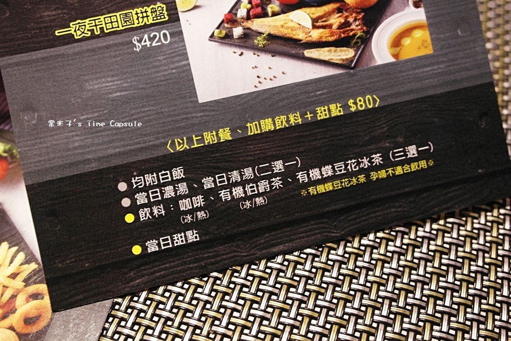 附餐: 1精緻小品2.手工麵包3.沙拉(2選1)4.醋飲