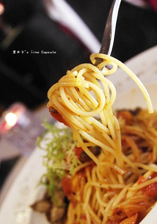 搭配的是紅醬的酸甜味,還有菇類的清甜,