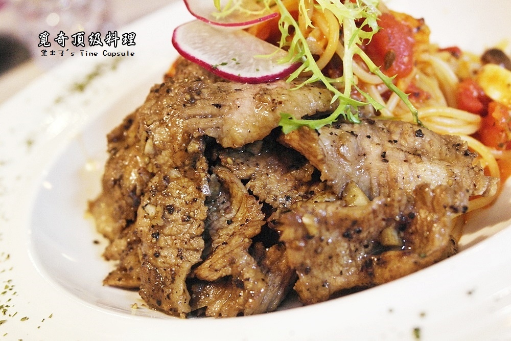 也因紅醬的酸甜讓鹹香松阪豬肉片味道更加爽口不油膩,