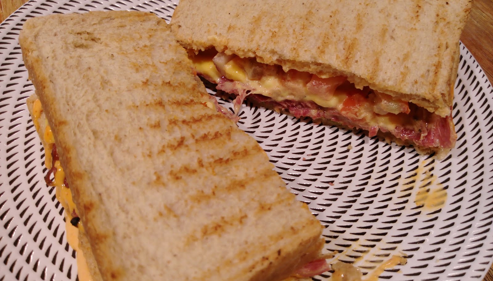 吐司麵包烤的酥酥的,洋蔥雖然才小小一圈但很嗆辣,還有一小片番茄讓整個三明治吃起來Juicy Juicy