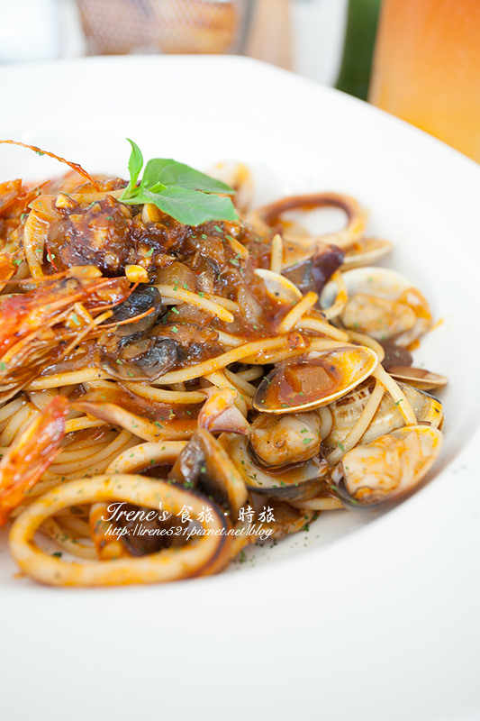 廣受三人好評的上海風情海鮮義大利麵,紅通通的醬汁,看似火辣,其實不然,