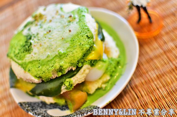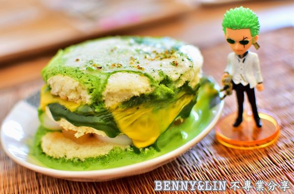 三層的厚燒鬆餅,淋上不同色澤的抹茶醬