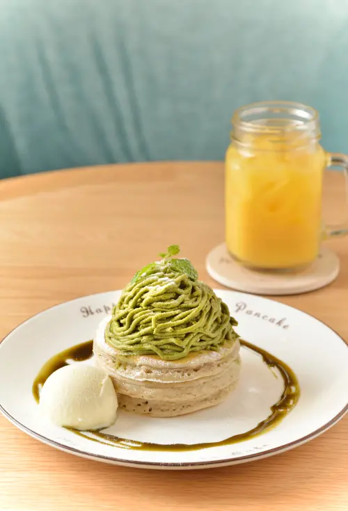 鬆餅加上抹茶蒙布朗泥、抹茶慕斯、鮮奶油