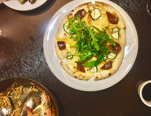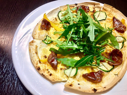 以芝麻葉、櫛瓜、以及白披薩為底,使臘腸味道能凸顯出來,伴以起司,很好吃