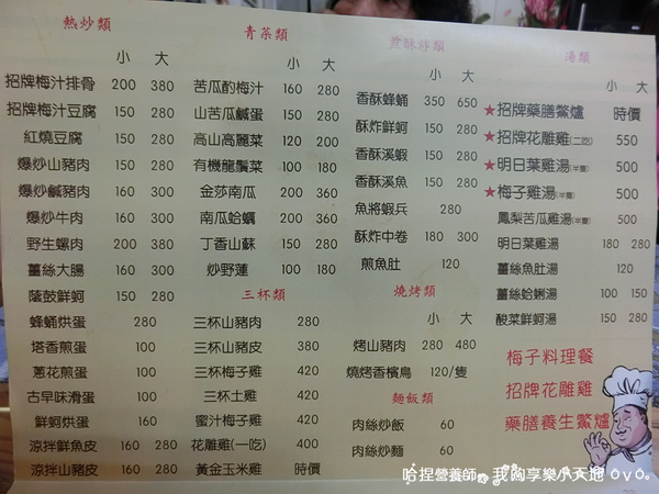 這是一家外觀很像原住民餐廳的熱炒店,看招牌的品項會發現很多元,有在地美食、原住民料理和一些客家小炒,當地盛產梅子所以梅子料理也不能錯過!