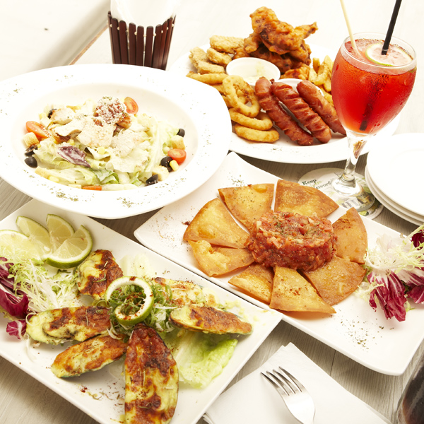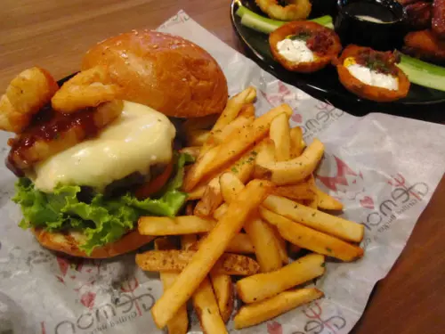 「COMEBELL歡樂拼盤」NT.320元/最適合美式餐廳莫過於共享歡樂型的超值大拼盤了,美式薯條、酥炸起司洋蔥圈。德式香腸、以及水牛城酸辣雞翅,無論是慶生同歡、或是觀看球賽,點上一盤,絕對氣持滿分!