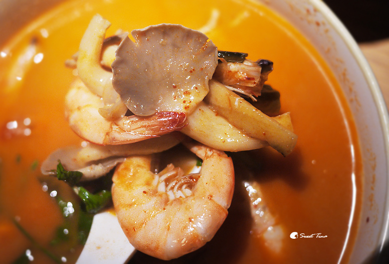 【酸辣蝦湯】辣度3 - 這道酸辣蝦湯,是我認為辣度最高的一道,但因為裡頭的蝦子夠多,再搭配多種菇類,湯其實還滿鮮甜的,所以我還是忍不住喝了2碗~