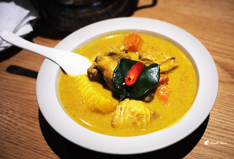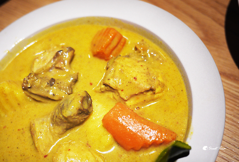 【黃咖哩雞】辣度2 - 黃咖哩與雞腿肉、紅蘿蔔、馬鈴薯一同熬煮後,香氣都鎖在裡頭了,雖然辣度較高些,但我們還是忍不住拿來拌飯,好香啊!