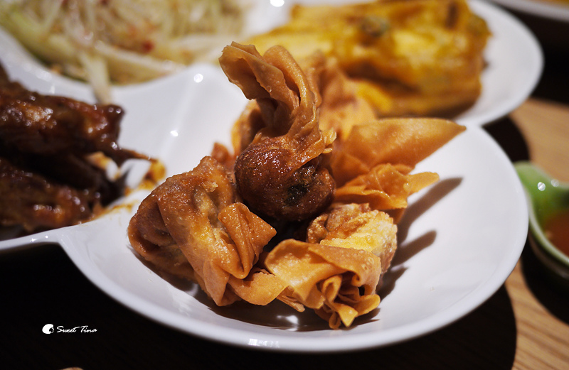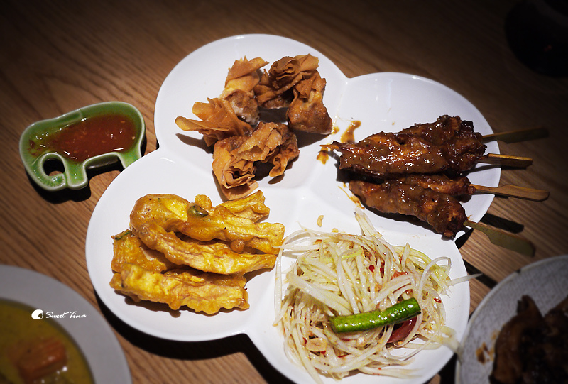 而這次我們品嚐的是4人套餐,裡頭的菜單內容為 - Thaipas拼盤(內含三種炸物+魚露青木瓜涼拌)、泰式圓茄炒松阪豬、月亮蝦餅、烤紙包魚(青辣椒or香料,2擇1)、黃咖哩雞、紅咖哩炒長豆、酸辣蝦湯、泰式奶茶(冰/熱)、饗泰多檸檬茶、羅旺子汁(冰/熱)、泰國茉莉香米(無限供應)