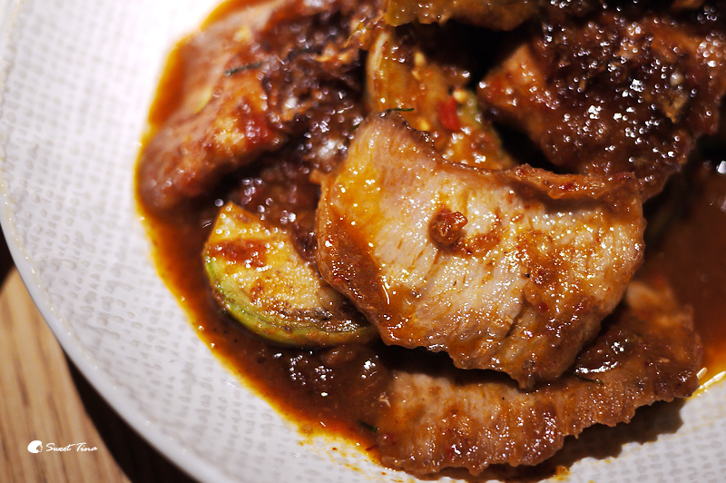 【泰式圓茄炒松阪豬】辣度1 - 烤過的松阪豬,軟中帶Q,口感上還滿不錯的,採用羅旺子膏一同拌抄,味道上多了點層次感,但這道對我而言,口味稍微重了些~