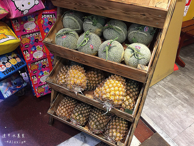 ▲小黑板下擺滿新鮮的哈密瓜和鳳梨