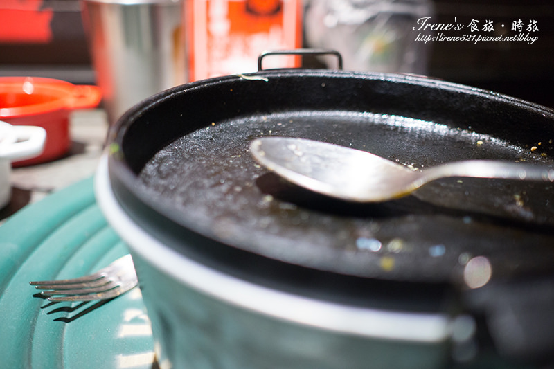 熱呼呼的鐵板放置在鐵桶上,份量看起來很過癮,其實鐵板很淺一層,