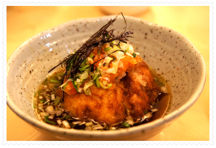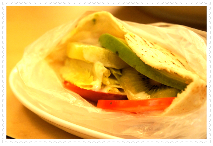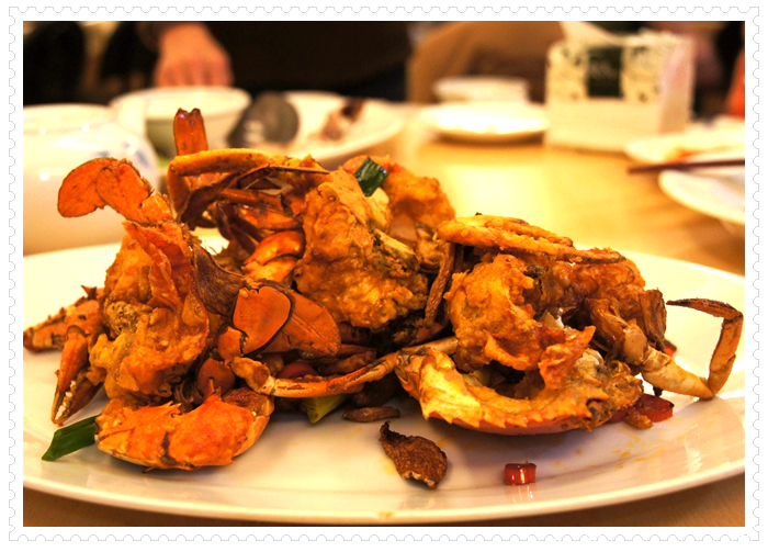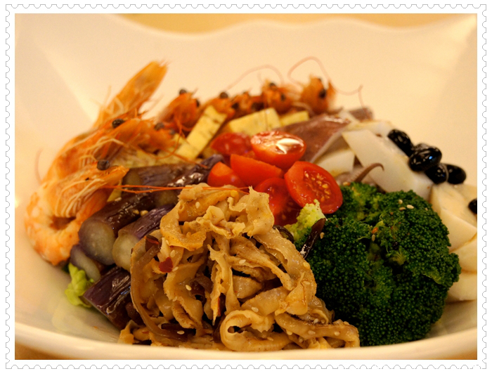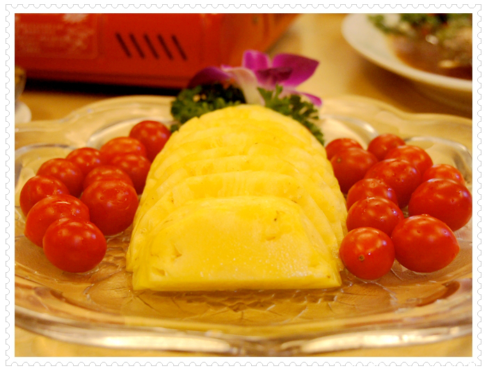相信嗎?海鮮餐廳還有為茹素者專門研製的個人套餐?大家心照不宣,很多餐廳因為油都是葷的,所以,客人吃素,就是外叫素食裝盤端上桌,因此,當我看到同桌友人吃著香椿拌麵,香氣直撲鼻而來,差一點就下手搶了;再看著連外賣都不肯,只有現做的水果捲餅,當下就想加訂一套素食套餐;再看到生菜牛蒡絲,那油炸的色澤,一看就知是新油所炸,我對這家餐廳的廚師忍不住豎起大姆指,在當今的餐廳中,這算是屈指可數的店家。就衝這態度,下次到台北,我會專程到松山。