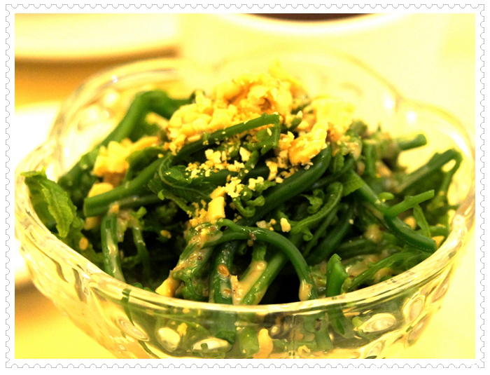 相信嗎?海鮮餐廳還有為茹素者專門研製的個人套餐?大家心照不宣,很多餐廳因為油都是葷的,所以,客人吃素,就是外叫素食裝盤端上桌,因此,當我看到同桌友人吃著香椿拌麵,香氣直撲鼻而來,差一點就下手搶了再看著連外賣都不肯只有現做的水果捲餅,當下就想加訂一套素食套餐;再看到生菜牛蒡絲,那油炸的色澤,一看就知是新油所炸,我對這家餐廳的廚師忍不住豎起大姆指,在當今的餐廳中,這算是屈指可數的店家。就衝這態度,下次到台北,我會專程到松山。