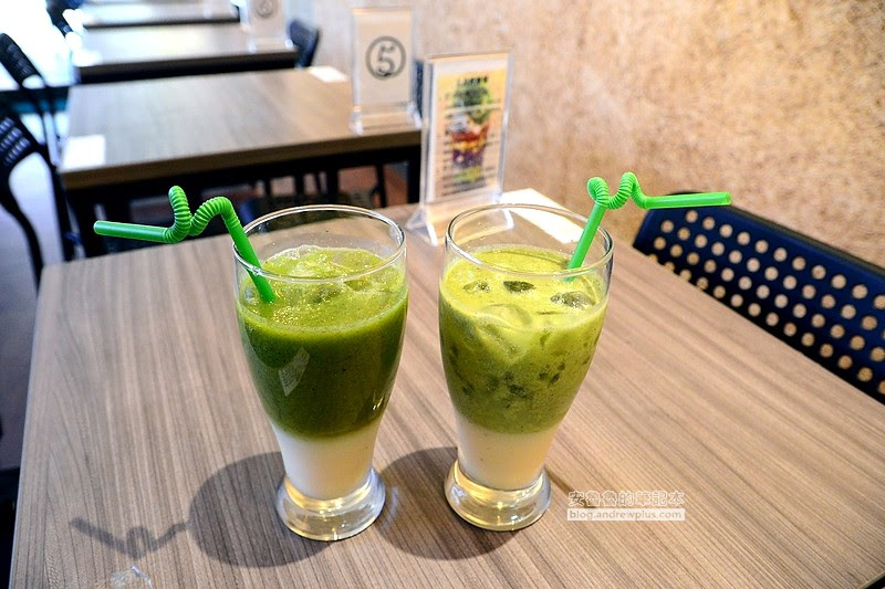 這兩杯飲料長得實在太像,所以先來說說右手邊淡綠色的那一杯綠色初號機,首先要把果汁先攪拌均勻再喝,鳳梨的滋味最明顯,再來是奇異果帶點澀澀的味道,一點蘋果的香氣,如果先喝上面綠色的那一半,滿口都是蔬果的甘味,不帶甜味,混合了下半部多多,比例拿捏的剛剛好,整杯喝起來甜度適中不會膩。