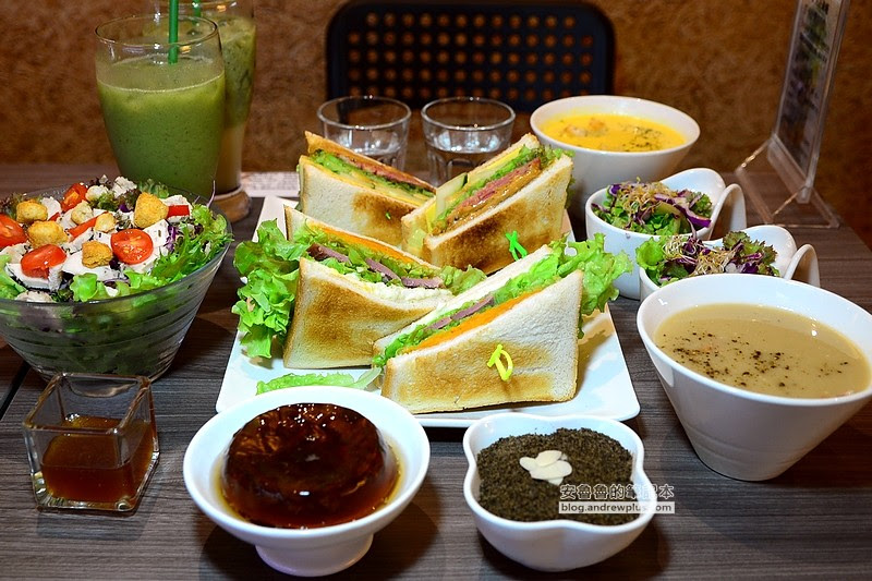 ▼上餐的速度很快,一下子我們的餐點就塞滿了桌面!當然要來張大合照~生菜沙拉的飲食不見得每個人都合適唷!如果是有慢性腎臟病的朋友,要小心生菜和果汁的鉀離子非常高,喝完了可能會不舒服,要特別注意!