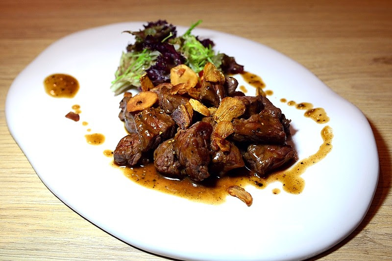 切成骰子大小般的肉塊,其實比骰子還大上不少,一口吃是剛剛好,上面淋上主煎牛排所滲出來的肉汁,讓肉品更加美味
