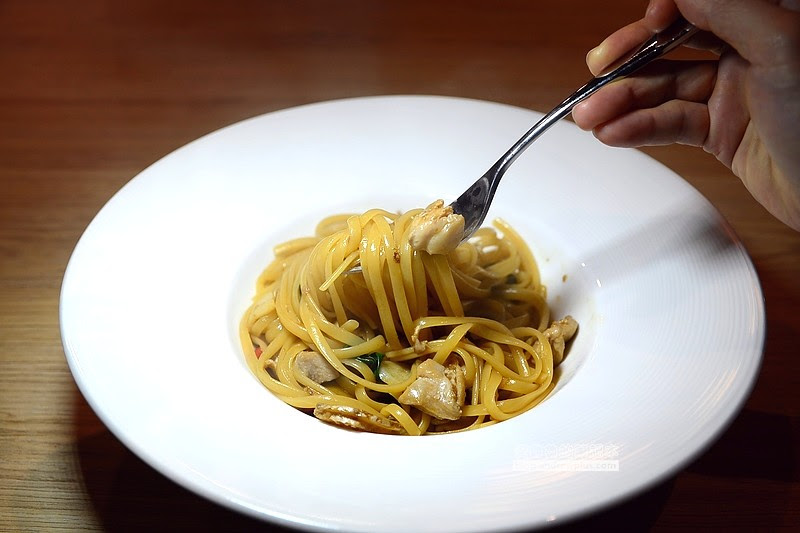 ▼使用較寬而且有點立體感厚度的麵條,淋上改良後的中式三杯雞醬汁,帶著微甜微辣的醬香和吃起來軟嫩又多汁的雞肉,讓人動了叉子就停不下來。