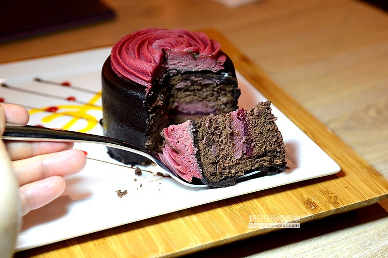 一靠近蛋糕櫃就被它上頭的玫瑰吸引,加上又是最愛的覆盆子、巧克力組合,二話不說就決定點來大快朵頤。