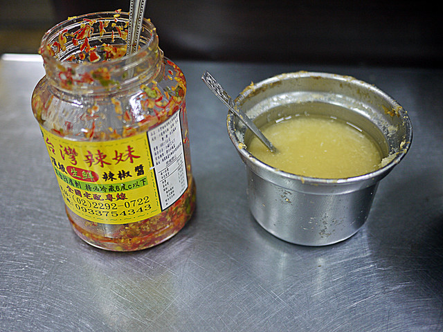 另外「碗粿之家」的桌上還有「蒜泥」和「辣椒醬」讓客人依喜好調整味道,是說如果剛剛帶點甜味的醬油、帶點輕辣微鹹的「甜辣醬」,這回再淋上這兩配角,我就不信嘴裡還有「米漿」之香生存的空間,不過說是這樣說單純的「米漿」多吃上兩口還真容易味覺疲憊,所以搭上這些醬也是一門學問,固然加什麼、加多少還得看個人的習慣而定。