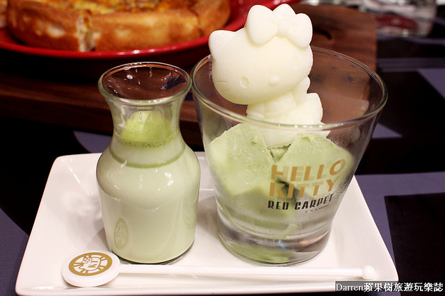有卡哇依的Hello Kitty冰磚,我選擇抹茶口味旁邊有溫抹茶要倒在杯子讓Kitty泡澡( ̄▽ ̄)