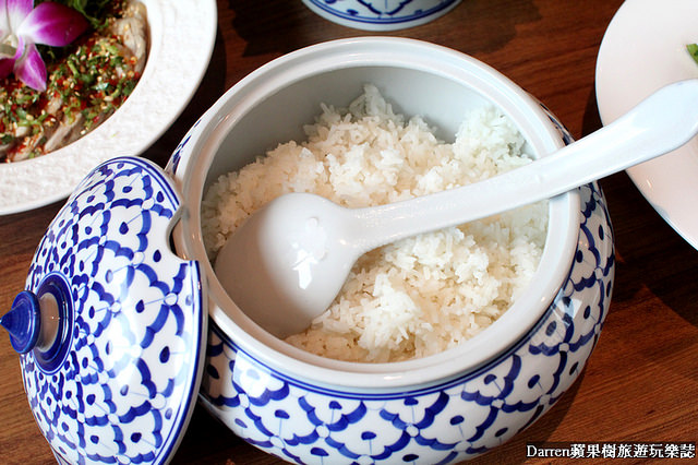 用青花瓷器裝盛的是泰國的香米飯,細長型的泰國香米扎實有彈性,口感很棒這種米飯搭配泰國菜最適合囉