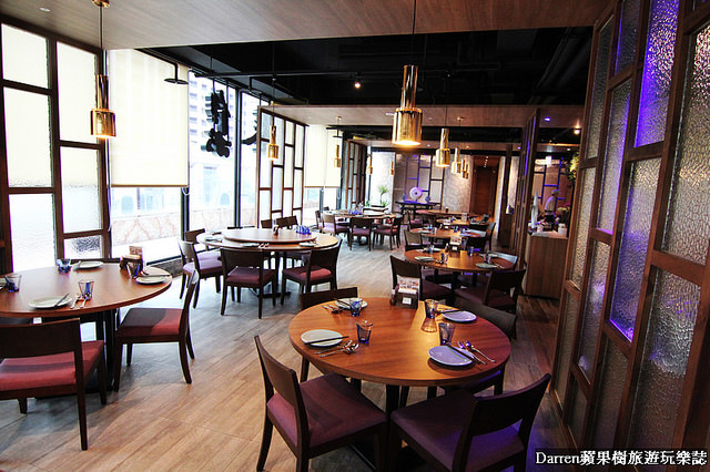 店內燈光設計投射紫色光線以及原木桌搭配紫色椅墊,整體環境高檔典雅用餐同時看著窗外景色視野不錯