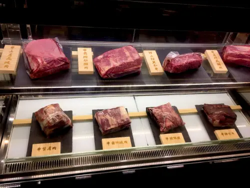 櫃檯旁的冷藏櫃冷藏著不同部位的熟成牛肉,單看牛肉超美的油花分布令人雀躍,生魚片有熟成牛肉當然也可以熟成,熟成就是冷藏的牛肉在真空袋內,利用牛肉本身的天然酵素進行熟成作用,讓肉質放鬆並將肉汁鎖在裡頭,裡面牛肉有牛前胸肋排肉、特上極黑和牛、牛背肩肉、牛霜降腹肉、牛橫膈膜、牛肩舺花排肉、牛腰內肉等等部位牛肉。