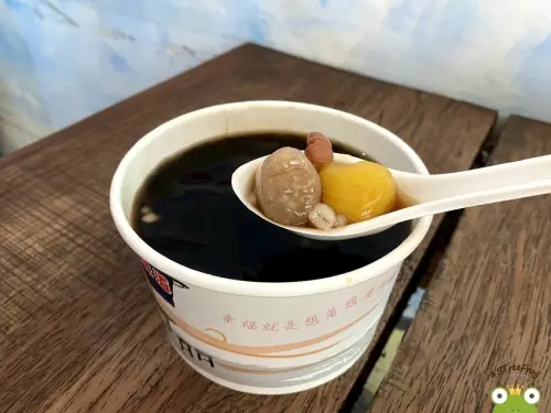 芋園跟仙草搭配,吃之前最好先攪拌一下,底層有些許糖水,黑嫩透亮的嫩仙草則是帶著微苦的仙草味道,一吃就知道用真的草藥下去熬煮,不過微苦的口感就看每個人是不是吃的習慣。