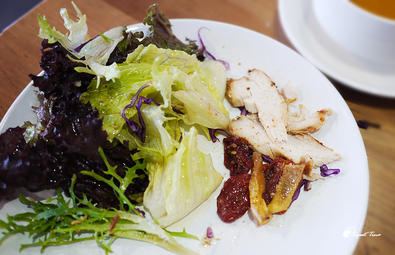 烘烤過後的雞胸肉,如果單吃會覺得稍微乾了點,但如果和裡頭的油醋及果乾一同搭配後,整個風味就提升不少,大推他們的水果乾,和沙拉一同食用非常提味,只可惜,裡面的量不多呢!