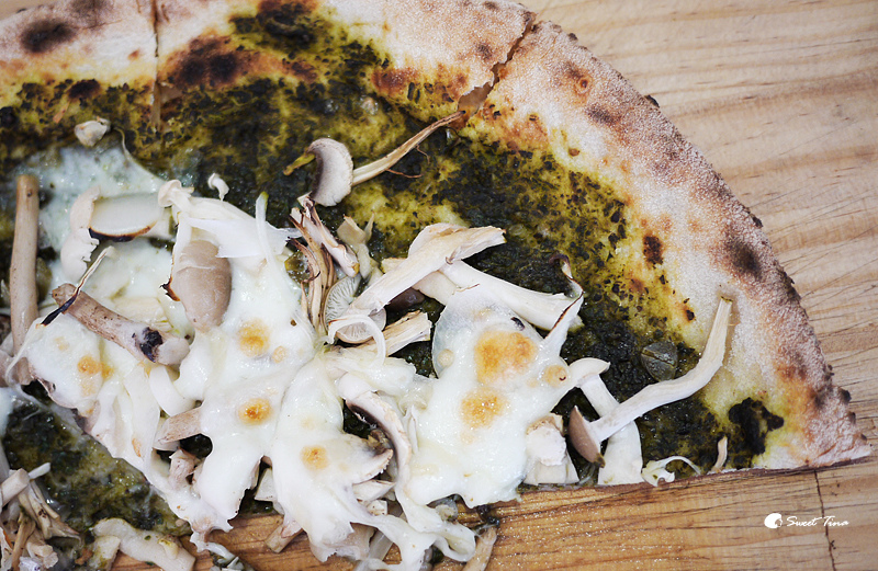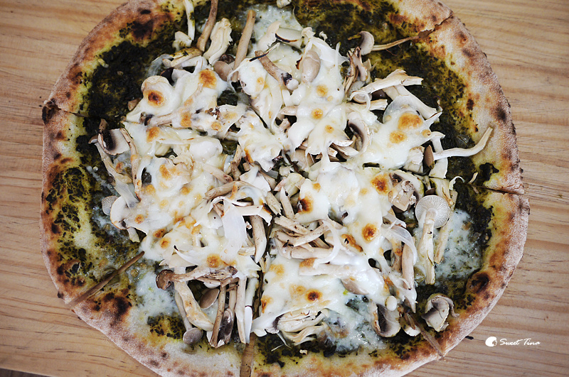 【PIZZA(野菇總匯)】採用青醬為基底,上面佈滿了各種野菇,是款素食的PIZZA哦!