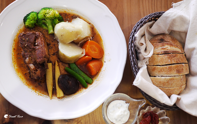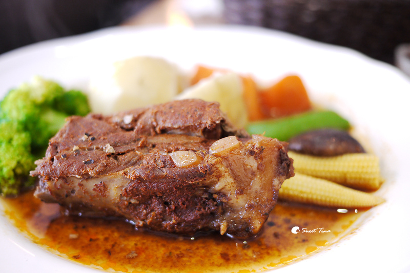 【香烤豬肋排】是套組合餐,除了豬助排、大量蔬菜、更是附贈了不少量的手工麵包呢! 是非常有飽足感的排餐哦。