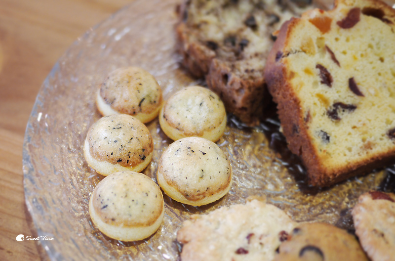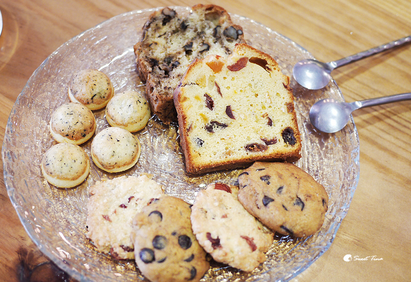 【限量手作甜點拼盤】裡面有帶有茶香的乳酪球、水果乾磅蛋糕、香蕉核桃磅蛋糕、巧克力餅乾、蔓越莓餅乾。