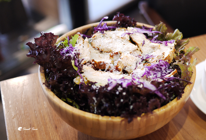 【雞肉鮮蔬沙拉】採用3~4樣左右的蔬菜,再搭配香烤過後的雞肉,裡頭更是放置了店家新鮮烘烤的鳳梨乾,及番茄油醋醬。