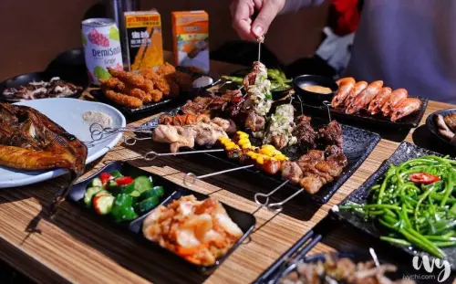 除了新鮮雞肉之外,菜盤還有三角軟骨、香菇、水蓮、杏鮑菇、香菇、紅蘿蔔,和印上老串燒字樣的豆腐等。