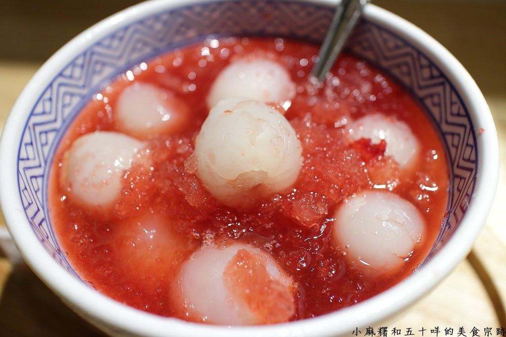 一上桌,糖水紅吱吱的誘人色澤刺激著視覺,誘惑牽動著口水的分泌,上桌時可能因為冰的溫度比較低,因此沒有比較明顯的香味被帶出,上面放著一顆荔枝心想這到底是什麼名堂。