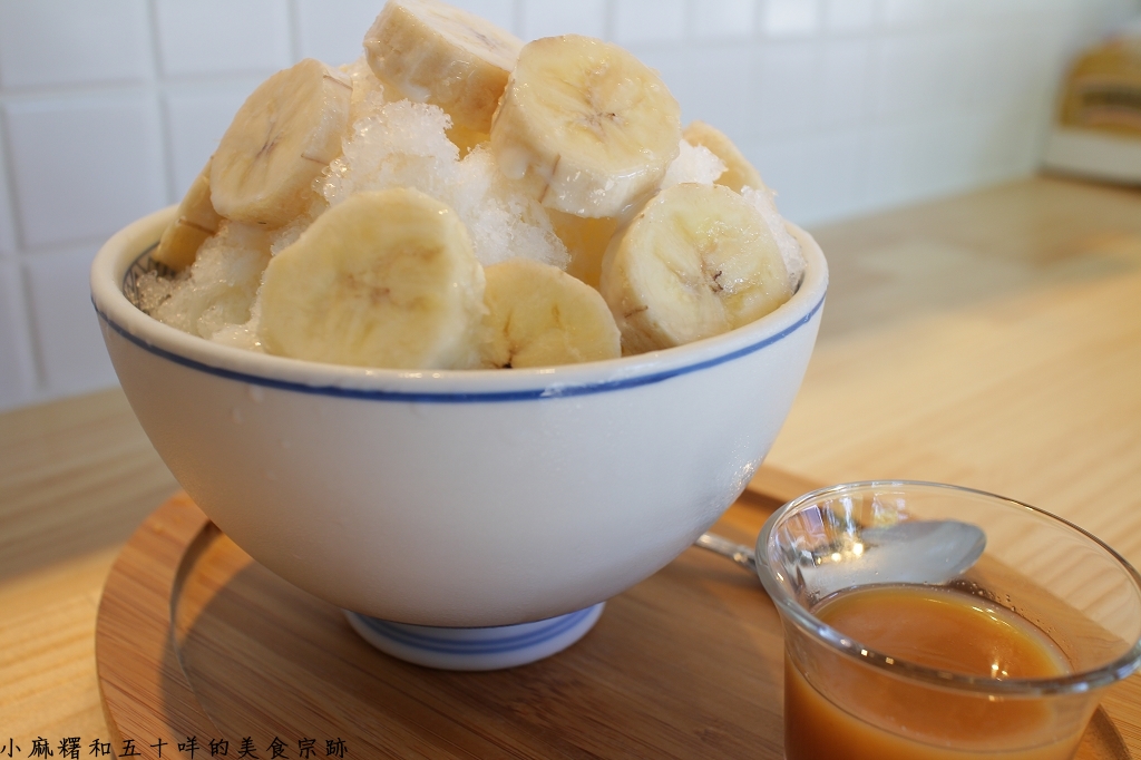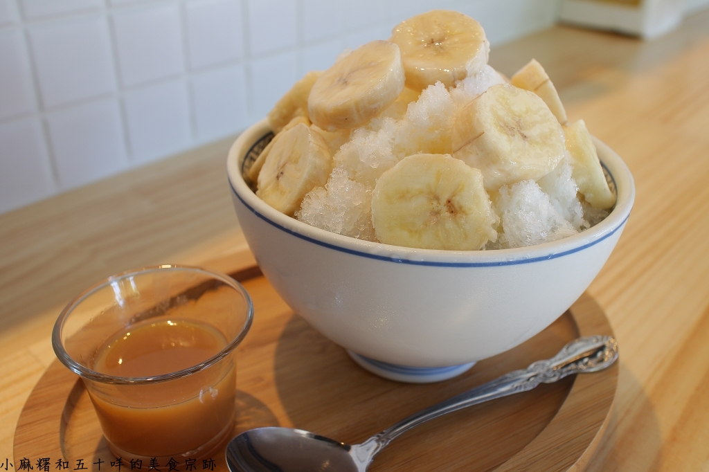 【香蕉牛奶糖】,售價是65元,上桌時會附上一小杯牛奶糖的糖水,剉冰底部有淋上鮮奶調配的糖水當底,最後在表面撒上香蕉切片。
