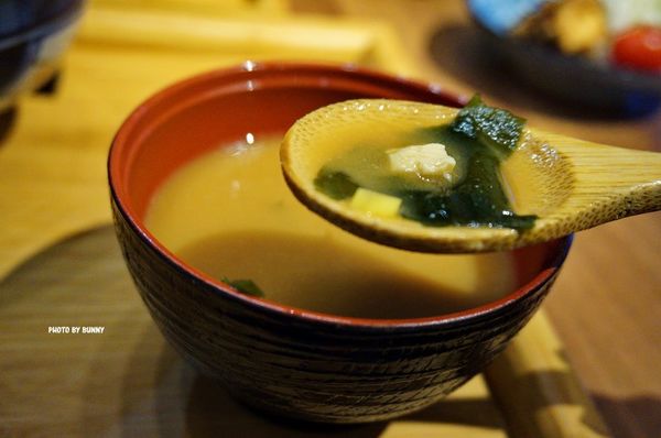 附餐搭配味噌湯、醃漬蘿蔔及水果醋