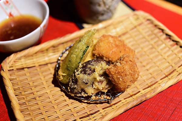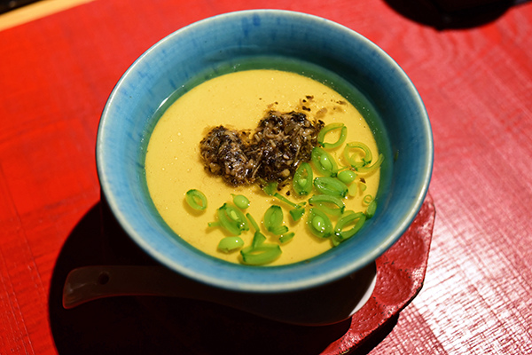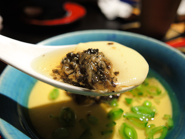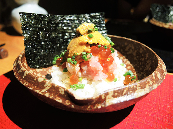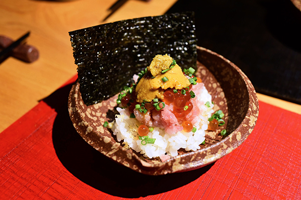 余韻的用料大方,小山丘海膽、滿滿的酒粕漬鮭鮭魚卵、鮪魚肉外,還有吃起來讓我們很驚豔的酥脆口感,原來是酥炸的天婦羅麵衣