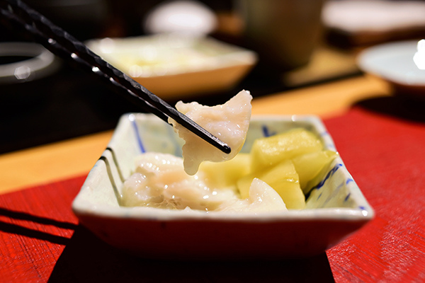 醃漬物與前湯同時上桌,在吃生魚片轉換口味時能搭配食用