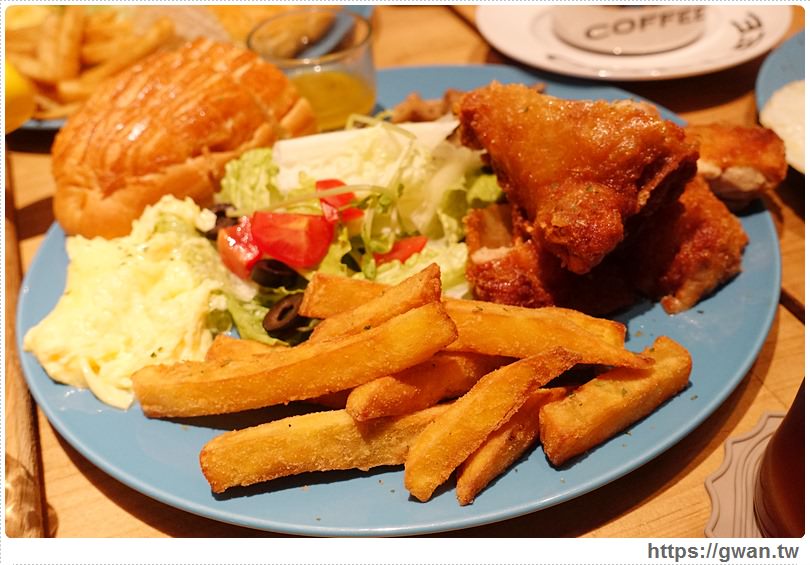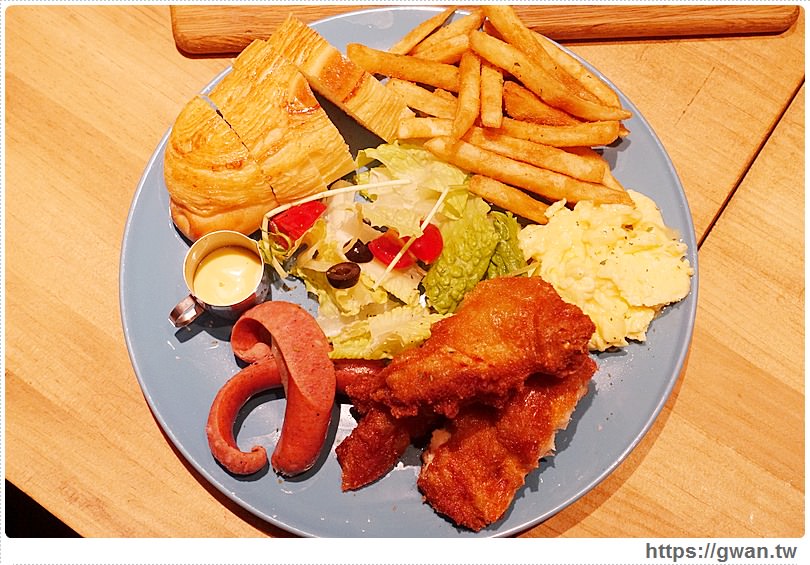 雞腿肉+香甜芒果醬+薯條+歐姆蛋+德式香腸+乳酪麵包