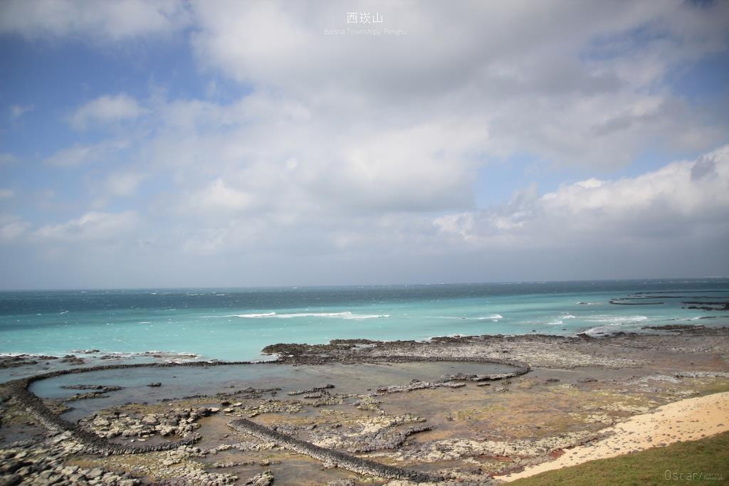 湛藍的海水 因退潮的關係 讓隱藏在海平面以下的石滬群得以裸露並展現在眼前