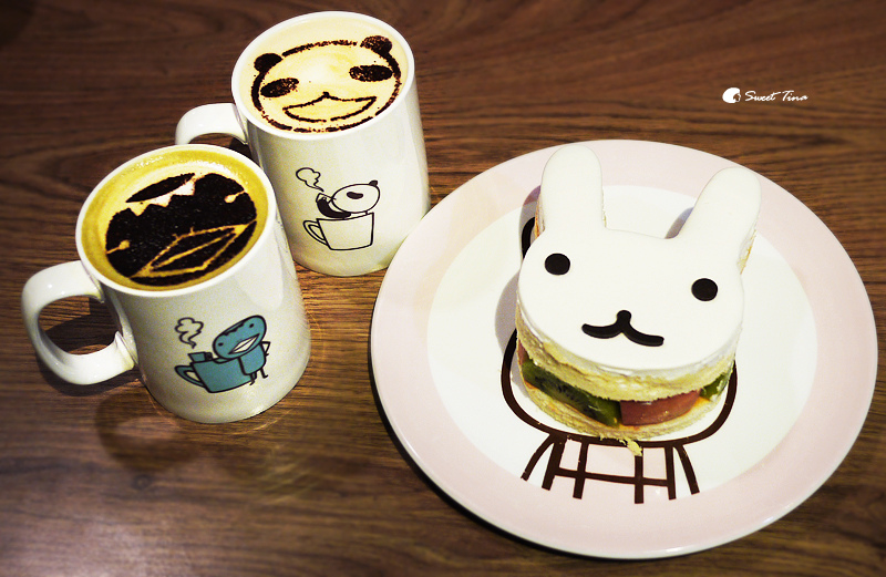 這天下午茶點了,一杯熊貓家的拿鐵咖啡、河童君的抹茶咖啡,白兔妹香草蛋糕。